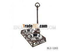 Antique Victorian style cast iron graces this double dog bowl withelegant scroll work and handle. It is perfect for pet use in yourhome or in the garden yard.